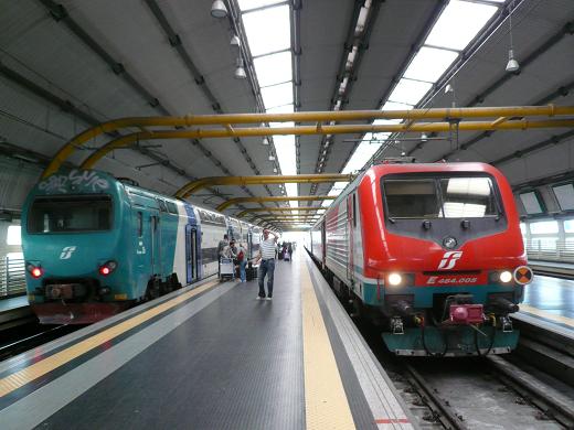 左の緑色の車両は各駅停車でローマ市内を通り、オルテ駅を結ぶ近郊電車。