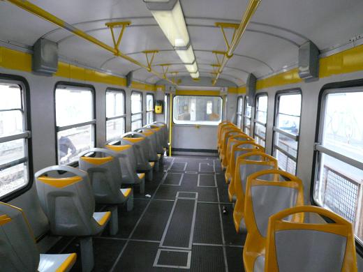 座席は左右で向きを逆にしたプラスチック製のクロスシート(正確にはベンチ)が並んでいた。