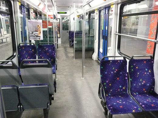 車内はクロスシートで、補助イスも付いている。