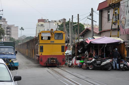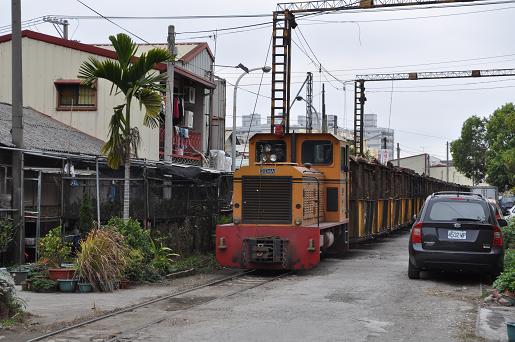 郊外の畑から製糖工場へ、収穫したサトウキビを満載した貨物列車が路地裏を走る姿が虎尾の名物だ。