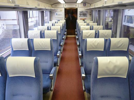 普通席はJR時代にグリーン席から格下げ改造を受けていて、この車両だけ回転リクライニングシートが並ぶ。