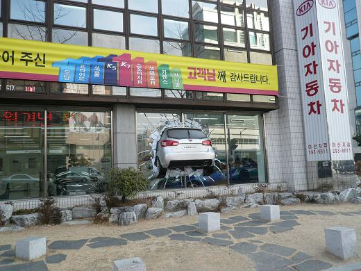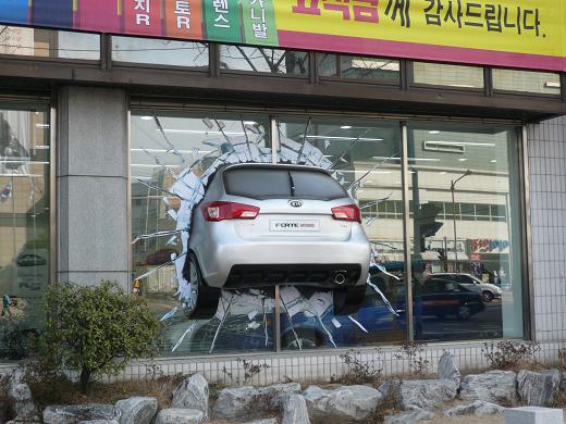 よーく見ると、自動車はガラスに貼り付けた広告。