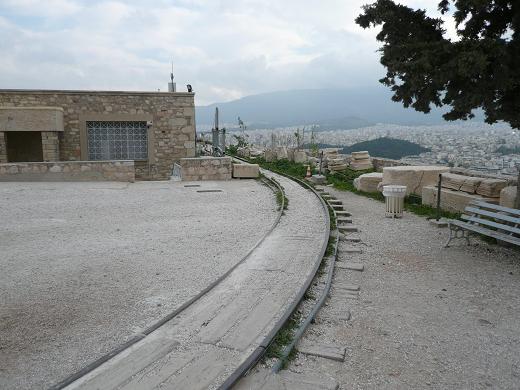 パルテノン神殿から延びるレールは緩やかな孤を描き、神殿の周囲を固める石垣の方へ。