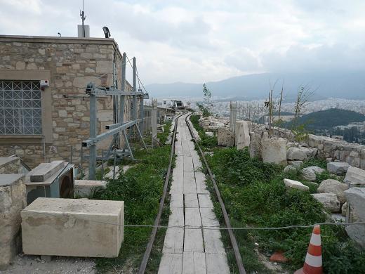 ちなみにパルテノン神殿に平行して自走式クレーンが設置してあり、このレールがこの間を繋いでいる。